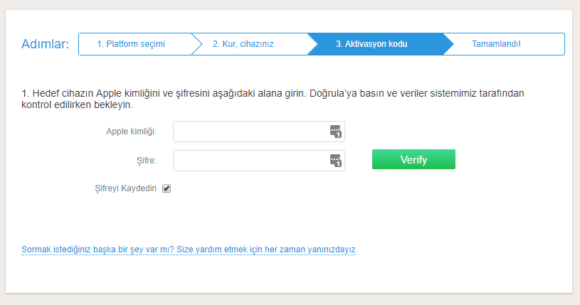 Bunun için direk kurulum sihirbazının 3’üncü adımına gelinmeli ve hedef cihazın Apple kimliği ve şifresi aşağıda istenilen yere girildikten sonra Verify yani Doğrula butonuna basmanız gerekir. Doğrula’ya bastıktan sonra veriler sistem tarafından doğruluğu kontrol edilir ve sonrasında “Tebrikler Ekranı” görünür Tamamlandı butonuna bastığınızda işlem tamamlanmış olur ve sizi hedef telefonu takip edeceğiniz kontrol paneline yönlendirir. Aynı zamanda kontrol paneline erişmek için çıkış yapıp tekrar girdiğinizde kontrol paneline erişmiş olursunuz.